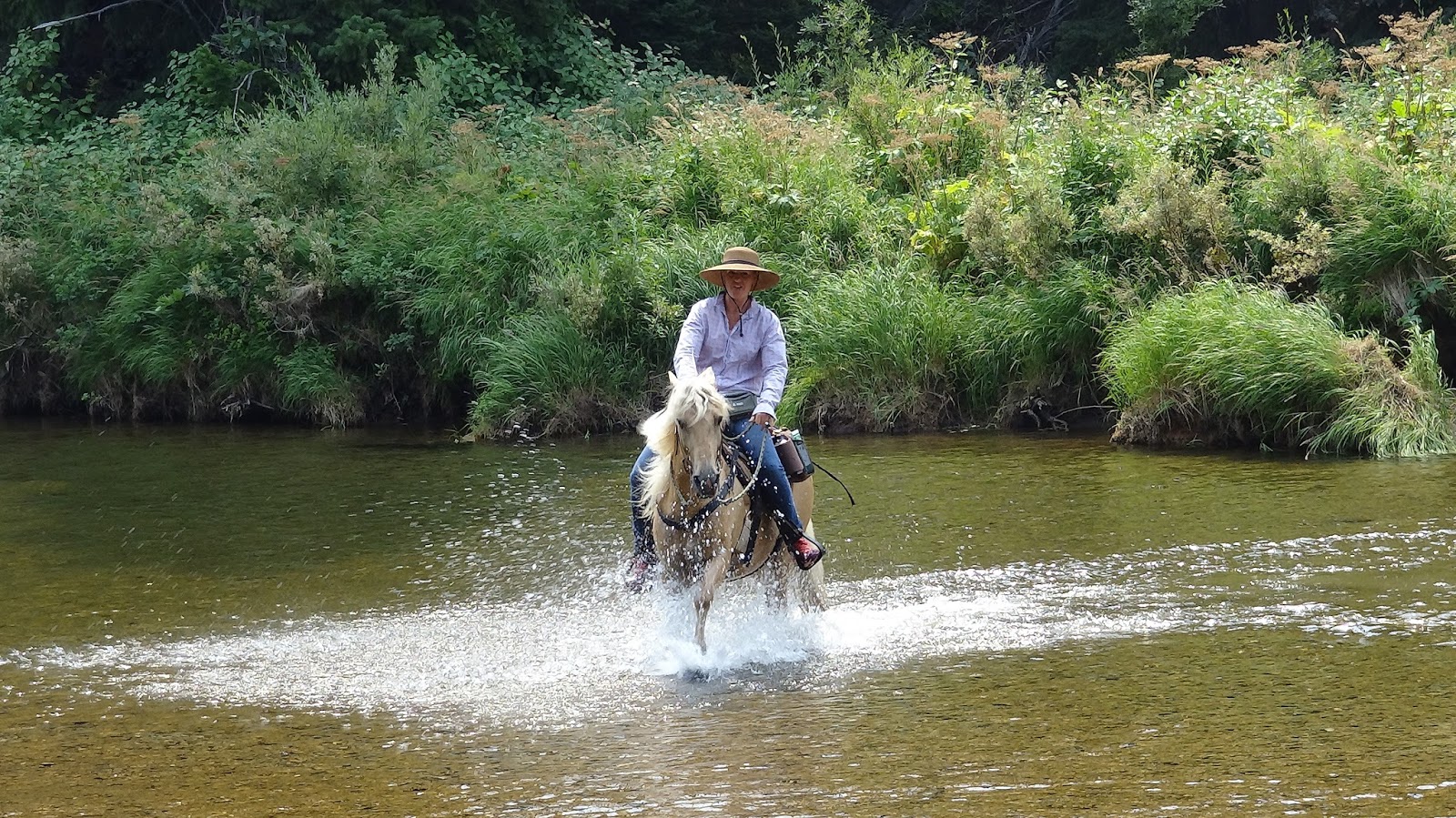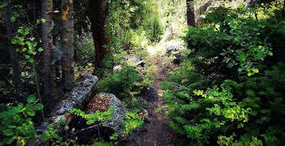 | Distance ridden, August 2015: 7 miles; Min Altitude=7,247'; Maximum altitude=7,661'; Ascent/descent=770'; trail conditions= 30% dirt/sand, 20% very rocky, 50% moderately rocky/gravelly. There are several bridge crossings and a couple of boggy areas. Barefoot horses in super good condition can do it without boots. Otherwise I recommend boots or shoes. |