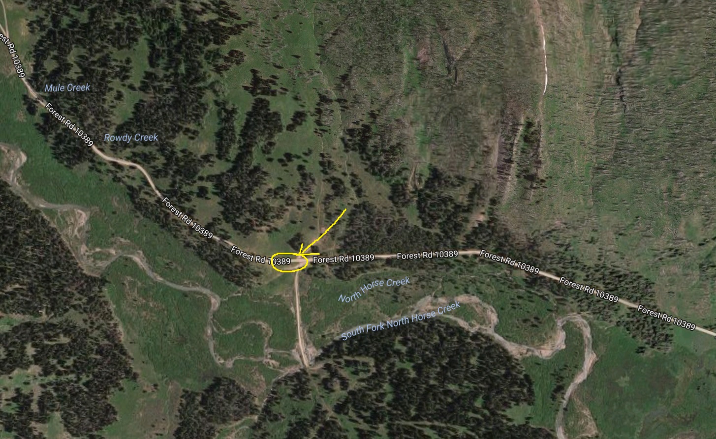| After traversing the meadow, Notice the hunting camp in the middle right. The stream CAN be crossed heading towards it, but we found a better crossing at the red arrow. Ride left of the two trees. There is also an even better crossing at the far right of the camp. |